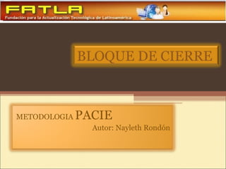 El documento describe la metodología del bloque de cierre de un curso virtual. Este bloque incluye una sección para negociar los requisitos de aprobación para estudiantes que no los cumplieron, una evaluación final para informar sobre las capacidades alcanzadas, una despedida para agradecer a los estudiantes y motivarlos para el próximo curso, la entrega de certificados digitales, y un espacio para que los estudiantes den retroalimentación sobre el curso.