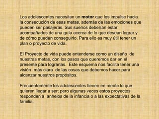 Este documento describe el proceso de elaborar un proyecto de vida durante la adolescencia. Explica que la adolescencia es una época de transición entre la niñez y la vida adulta caracterizada por cambios y retos. Propone que los adolescentes deben reflexionar sobre sus intereses, capacidades y metas para el futuro a fin de diseñar un proyecto de vida único que los guíe hacia la consecución de sus sueños.