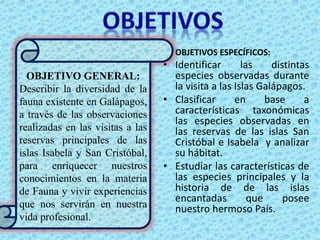 Este documento describe una visita a las islas Galápagos de Ecuador para estudiar la diversa fauna de la región. Los objetivos específicos fueron identificar y clasificar especies observadas en las islas San Cristóbal e Isabela, y analizar su hábitat. El objetivo general fue describir la diversidad de la fauna de Galápagos a través de observaciones en reservas. La metodología incluyó visitas a diferentes lugares en las islas para observar especies como iguanas, lobos marinos, tortugas, y aves. Como conclusión