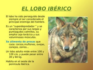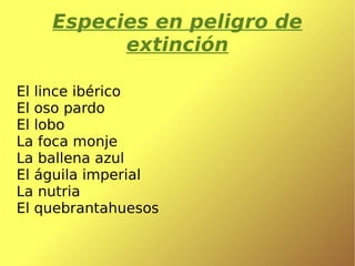 Este documento describe varias especies animales en peligro de extinción en España, incluyendo el lince ibérico, oso pardo, lobo ibérico, foca monje, ballena azul, águila imperial, nutria y quebrantahuesos. Proporciona detalles sobre su apariencia física, dieta, hábitat y estado de conservación.