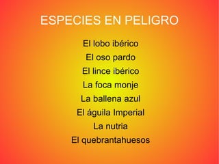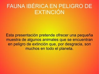 Este documento presenta varias especies de fauna ibérica que se encuentran en peligro de extinción, como el lobo ibérico, el oso pardo, el lince ibérico, la foca monje, la ballena azul, el águila imperial, la nutria y el quebrantahuesos. Brevemente describe las características físicas y de hábitat de cada especie y explica que su supervivencia está amenazada.