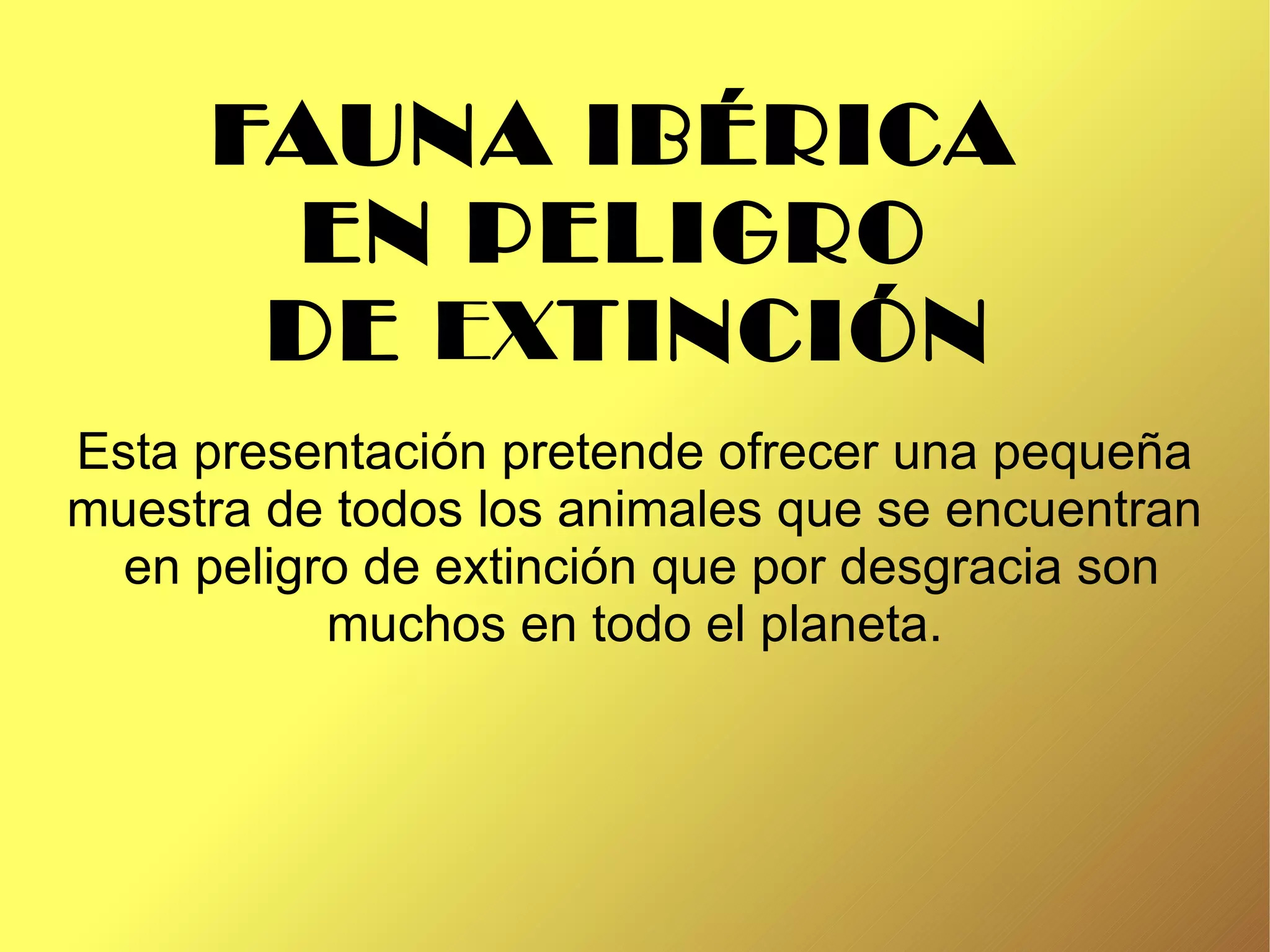Este documento presenta ocho especies de fauna ibérica que se encuentran en peligro de extinción: el lince ibérico, el oso pardo, el lobo ibérico, la foca monje, la ballena azul, el águila imperial, la nutria y el quebrantahuesos. Se describe brevemente el aspecto físico, hábitat y dieta típicos de cada especie.