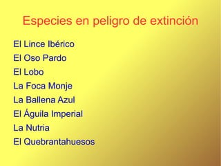Este documento describe varias especies de fauna ibérica que se encuentran en peligro de extinción, incluyendo el lince ibérico, el oso pardo, el lobo ibérico, la foca monje, la ballena azul, el águila imperial, la nutria y el quebrantahuesos.