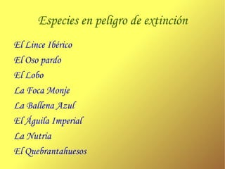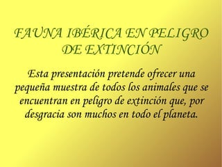 Este documento describe varias especies de fauna ibérica que se encuentran en peligro de extinción, incluyendo el lince ibérico, el oso pardo, el lobo ibérico, la foca monje, la ballena azul, el águila imperial, la nutria y el quebrantahuesos. Cada especie se describe brevemente, destacando sus características físicas, su dieta y su hábitat natural.