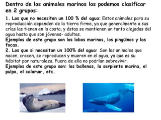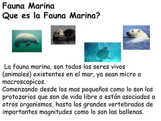 Este documento describe la fauna marina, que incluye todos los seres vivos que existen en el mar, desde microorganismos como protozoos hasta grandes vertebrados como las ballenas. Explica que la fauna marina se puede clasificar en dos grupos: aquellos que no necesitan vivir completamente en el agua, como lobos marinos y pingüinos, y aquellos que sí requieren vivir permanentemente en el agua, como ballenas, pulpos y calamares.