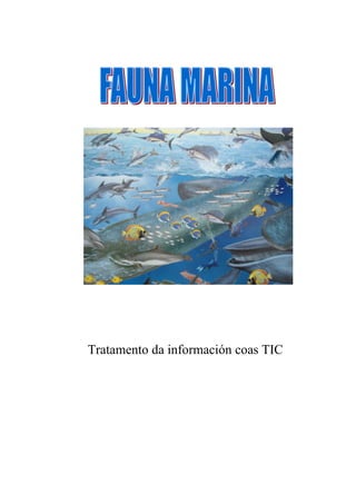 Este documento presenta información sobre varias especies marinas como la avispa de mar, el camarón, el pez globo, el arao, la estrella de mar, el pez escorpión, el pez gato y la foca. Describe sus características físicas, hábitats, comportamientos y dietas.