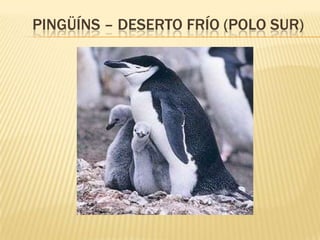 Este documento lista ejemplos representativos de fauna de diferentes ecosistemas terrestres, incluyendo pingüinos y osos polares en el desierto frío de los polos, renos, lobos y otros animales en la tundra, osos y alces en la taiga, bisontes y coyotes en la estepa, gatos montés y mangostas en bosques caducifolios y mediterráneos, y gacelas, búfalos y camellos en sabanas y desiertos cálidos.