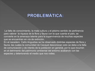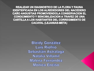 El documento describe un proyecto para identificar y clasificar la flora y fauna presente en el nacedero Caño Angustias en el corregimiento de Cacayal, Colombia y crear una cartilla para educar a la comunidad local sobre la biodiversidad y la importancia de su conservación. El proyecto incluye actividades de identificación, clasificación taxonómica, elaboración de una cartilla y charlas de sensibilización para promover la protección de las especies.