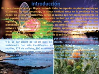 Ecuador tiene una gran diversidad de flora y fauna, con aproximadamente el 10% de todas las especies de plantas y el 8% de las especies de animales del mundo. Algunos de los ecosistemas más biodiversos son los Andes, la Amazonía y Galápagos, que albergan miles de especies de plantas, cientos de especies de aves endémicas, y una amplia variedad de mamíferos, reptiles, anfibios y peces. La ruta de aviturismo en el sur de Ecuador permite observar muchas de estas especies de aves