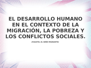El documento describe el contexto socioeconómico y sociocultural de Fausto, un niño migrante. Vivía en una comunidad con extrema pobreza, falta de trabajo y educación de baja calidad, lo que dificultó su desarrollo. Debido a estas condiciones desfavorables, muchos de la comunidad, incluyendo a Fausto, emigraron para buscar mejores oportunidades y una vida mejor.