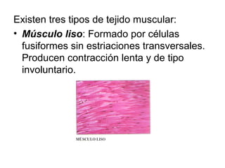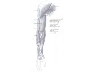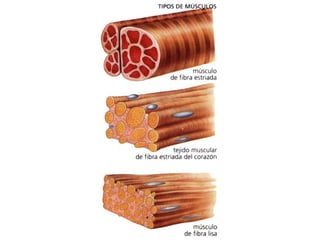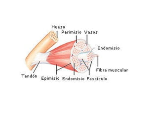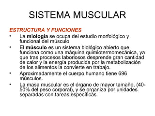 Este documento describe la estructura y funciones del sistema muscular. Explica que existen tres tipos principales de tejido muscular y describe la estructura macroscópica y microscópica del músculo esquelético. También resume los tipos de fibras musculares, el mecanismo de contracción muscular y las funciones que pueden desempeñar los músculos.