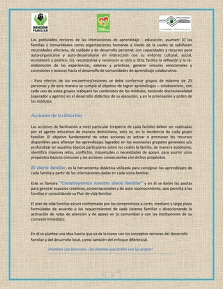 Este documento presenta un manual de autoaprendizaje para agentes educativos de un programa de bienestar familiar en Colombia. El manual explica el proceso de aprendizaje grupal y las acciones de facilitación que deben llevar a cabo los agentes. El proceso de aprendizaje se basa en temas como vínculos de cuidado mutuo, género, sexualidad y salud familiar. Los agentes deben formar grupos de hasta 25 personas para trabajar los contenidos de los módulos de manera colaborativa. También deben realizar visitas d