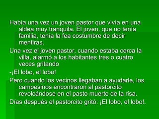 Un joven pastor tenía la costumbre de mentir diciendo que había un lobo cuando en realidad no lo había, por lo que cuando finalmente hubo un lobo de verdad que atacaba a sus ovejas, nadie le creyó y el lobo pudo destrozar todo su rebaño. La moraleja es que a un mentiroso nunca se le cree, aunque diga la verdad.