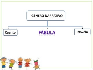 Este documento resume las características de la fábula como un género narrativo. Las fábulas suelen ser historias breves con personajes animales que presentan características humanas. Tienen un inicio, desarrollo de un conflicto y desenlace, y entregan una enseñanza o moraleja. Además, presenta la fábula de "El cuervo y la vasija" de Esopo como ejemplo.