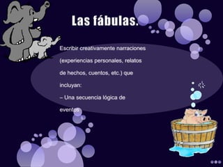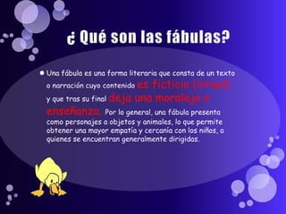 Este documento describe las características fundamentales de las fábulas, incluyendo su estructura narrativa sencilla con un principio, desarrollo y final, el uso de animales u objetos personificados como personajes principales, y el propósito didáctico de incluir una moraleja o lección moral al final.