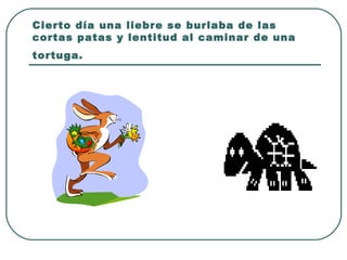 La fábula cuenta la historia de una liebre arrogante que acepta el desafío de una tortuga más lenta de competir en una carrera. A pesar de su lento paso constante, la tortuga logra cruzar la meta primero mientras la liebre se queda dormida a mitad de camino. El mensaje es que con seguridad, constancia y paciencia se puede obtener el éxito aunque a veces parezca que se va lento.