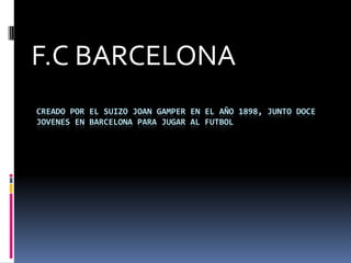 El F.C. Barcelona fue creado en 1898 por el suizo Joan Gamper con doce jóvenes en Barcelona para jugar al fútbol. El equipo se considera el mejor del siglo XXI debido a su estilo de juego conocido como tiki-taka. Algunos de los jugadores más importantes son Puyol, Xabi, Iniesta, Messi, Neymar, Busquets, Jordi Alba, Bartra y Piqué.