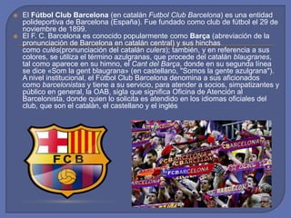 El Fútbol Club Barcelona es un club de fútbol y polideportivo fundado en 1899 en Barcelona, España. Es uno de los equipos más exitosos y populares a nivel mundial, habiendo ganado numerosos títulos nacionales e internacionales. El FC Barcelona destaca por contar históricamente con algunos de los mejores jugadores del mundo, como Lionel Messi, considerado por muchos como el mejor de la historia.