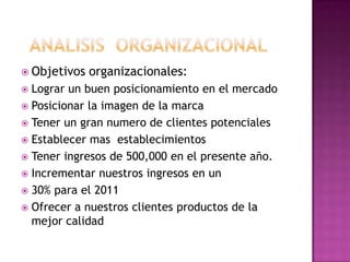 Este documento presenta los objetivos, recursos y análisis funcional de una empresa de repostería. Los objetivos incluyen posicionarse en el mercado, aumentar los ingresos y ofrecer productos de alta calidad. Los recursos detallan el equipo, materiales, financiamiento y personal requerido. Finalmente, se describe un programa de capacitación para un nuevo jefe de área que incluye demostraciones prácticas de procedimientos y la preparación del tiramisú.
