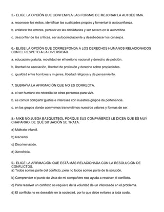 Este documento presenta un examen diagnóstico de Formación Cívica y Ética para estudiantes de secundaria. Consiste en 15 preguntas de opción múltiple sobre temas como la dignidad humana, los derechos humanos, la justicia, la resolución de conflictos, la discriminación y la autoestima. El examen evalúa la comprensión de los estudiantes sobre estos conceptos y valores cívicos y éticos fundamentales.
