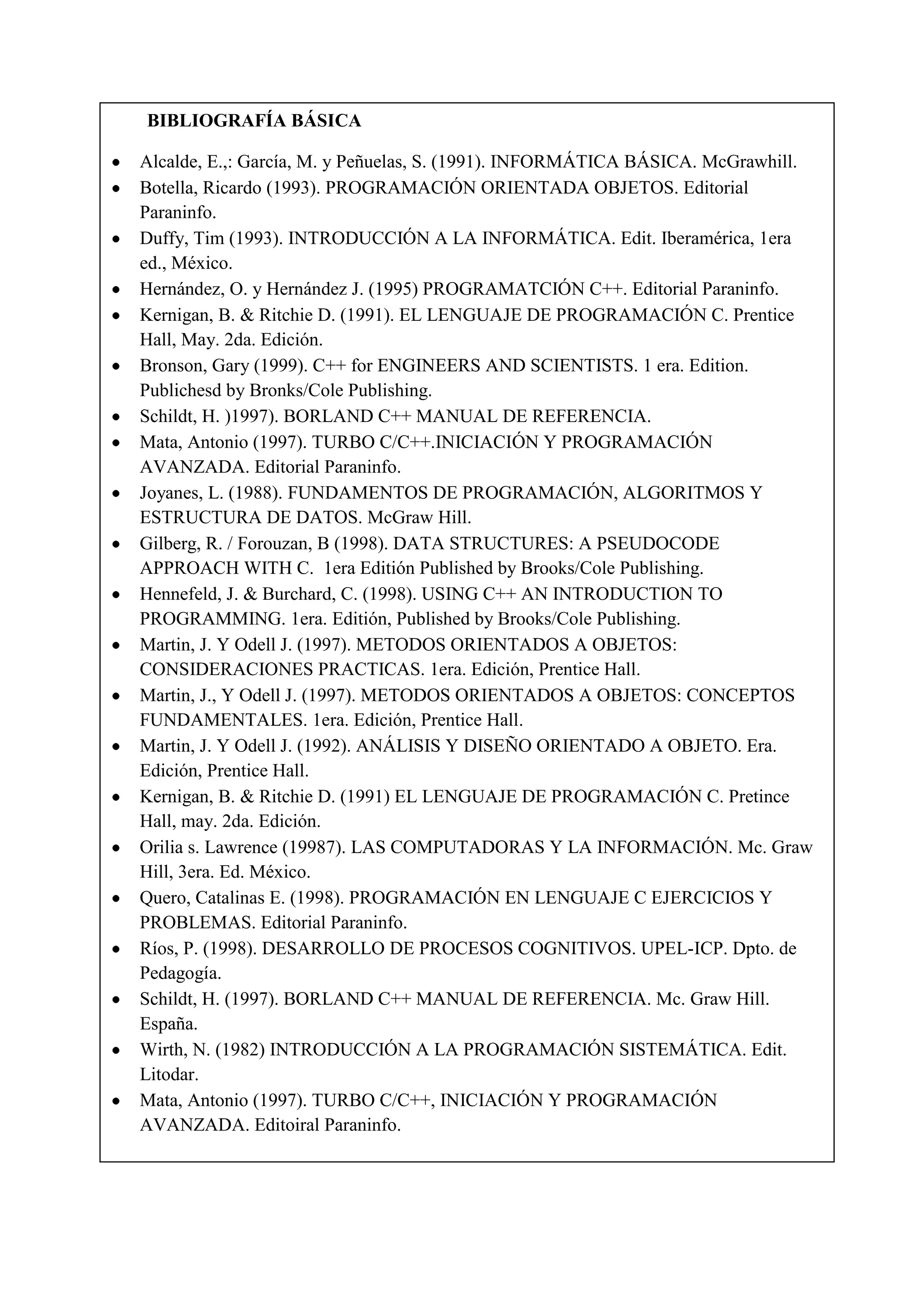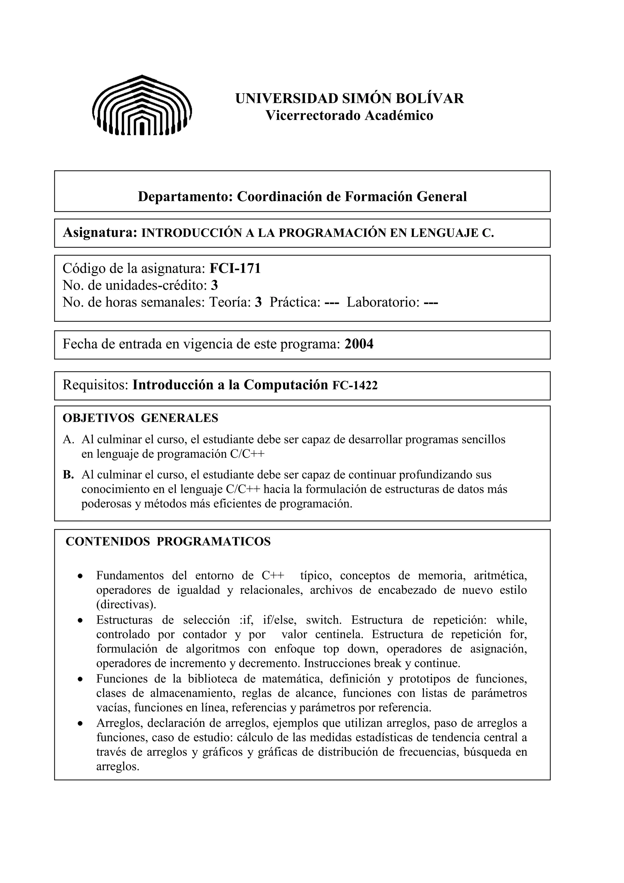 Este documento presenta la descripción de un curso de introducción a la programación en lenguaje C. Los objetivos generales son que los estudiantes puedan desarrollar programas sencillos en C/C++ y profundizar sus conocimientos en estructuras de datos más avanzadas. Los contenidos incluyen fundamentos de C++, estructuras de selección y repetición, funciones, arreglos y estadísticas. Se proporciona una bibliografía básica de 20 libros de referencia sobre programación, lenguaje C, estructuras de datos y met