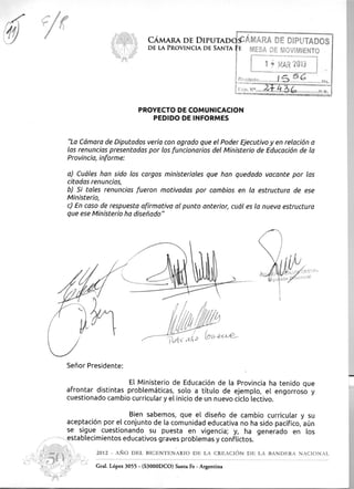 La Cámara de Diputados de la provincia de Santa Fe solicita al Poder Ejecutivo que informe sobre las recientes renuncias en el Ministerio de Educación, incluyendo los cargos que quedaron vacantes, si las renuncias estuvieron motivadas por cambios en la estructura del Ministerio, y en ese caso cuál es la nueva estructura. El documento explica que el Ministerio ha tenido que lidiar con problemas como un polémico cambio curricular y conflictos docentes, y que las renuncias generan sensaciones de abandono.