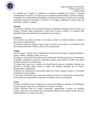 Este documento presenta una guía sobre los elementos o factores de la comunicación. Explica que la comunicación involucra un emisor, receptor, mensaje, código, canal y contexto. Define cada uno de estos elementos y proporciona ejemplos para que los estudiantes identifiquen los factores en diferentes situaciones comunicativas. Finalmente, la guía incluye preguntas para que los estudiantes apliquen sus conocimientos.