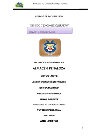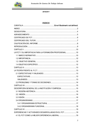 Este documento presenta un informe sobre la Formación de Centros de Trabajo (FCT) realizada por una estudiante. El primer capítulo destaca la importancia de la FCT para la formación profesional y su marco normativo según la Constitución ecuatoriana. El segundo capítulo describe las expectativas y desafíos de la FCT. El tercer capítulo presenta la misión, visión y estructura organizacional de la empresa donde se realizó la pasantía. Finalmente, el cuarto capítulo resume las experiencias y actividades desarrolladas durante la F