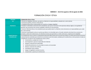 El documento presenta el plan de estudios de Formación Cívica y Ética para la semana del 24 al 28 de agosto de 2020 para segundo grado. El eje temático es la persona con dignidad, derechos y responsabilidades. El propósito es fortalecer la identidad de los estudiantes y enseñarles a ejercer su libertad de manera responsable. Las competencias a desarrollar incluyen el autoconocimiento, resolución de conflictos y participación democrática. El primer tema es sobre el crecimiento personal de los niños, y la actividad