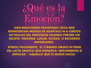 Este documento trata sobre las emociones, definiéndolas como reacciones psicofisiológicas que representan modos de adaptación a estímulos. Explica que etimológicamente la palabra emoción viene del latín y significa "movimiento o impulso". Además, discute las teorías evolutivas de Darwin sobre las emociones y cómo expresiones faciales y de postura comparten orígenes en humanos y otros animales. Finalmente, resume algunas de las primeras teorías sobre las emociones como la teoría de James