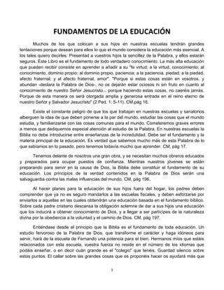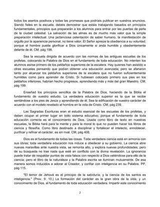 El documento describe la Biblia como el fundamento de toda educación verdadera. Señala que la Biblia debe ser el libro de texto principal en las escuelas y que un estudio fervoroso de la Palabra de Dios transformará el carácter y preparará a los estudiantes para servir. También enfatiza que el amor a Dios es la base de toda educación y que Jesucristo es el único fundamento sobre el cual se puede construir.