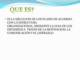 Este documento resume los conceptos clave del proceso administrativo de dirección, incluyendo la ejecución de planes de acuerdo a la estructura organizacional mediante la guía de esfuerzos a través de la motivación, comunicación y liderazgo. Explica que la dirección pone en marcha los lineamientos de planeación y organización para lograr los objetivos de la organización a través de la integración, toma de decisiones, supervisión, comunicación y motivación del personal. Finalmente, enfatiza la importancia de la autoridad y el liderazgo