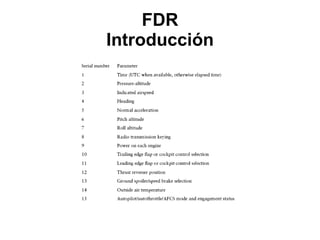 Este documento describe los dos modos de registro de datos de vuelo que existen: registro por trazados y registro digital electromagnético (DFDR). El DFDR recibe datos digitales del vuelo y los graba en una cinta magnética o memoria sólida. Cuenta con conexiones externas de energía, la unidad de adquisición de datos y un equipo de prueba automático. También incluye un localizador subacuático para detectar la ubicación del DFDR si se hunde en el agua.