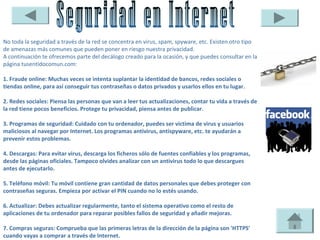Este documento presenta un decálogo de consejos para proteger la privacidad y seguridad en Internet. Algunas de las recomendaciones incluyen proteger contra el fraude en línea mediante el uso de contraseñas seguras, proteger la información personal en redes sociales y dispositivos móviles, mantener los sistemas actualizados, y verificar la seguridad de sitios web antes de realizar compras o descargar archivos. Además, señala que aunque existen riesgos en Internet, también hay mejores opciones de protección que con los mé