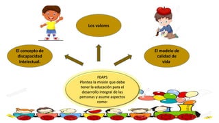 Este documento describe la evolución histórica del tratamiento de las personas con discapacidad y el papel de la educación y la sociedad a lo largo del tiempo. Comienza con la segregación y exclusión, luego pasa a la integración a través de escuelas especiales, y más recientemente a la inclusión plena a través de un modelo educativo centrado en la persona. También analiza conceptos como discapacidad, ciudadanía y calidad de vida desde una perspectiva de derechos.