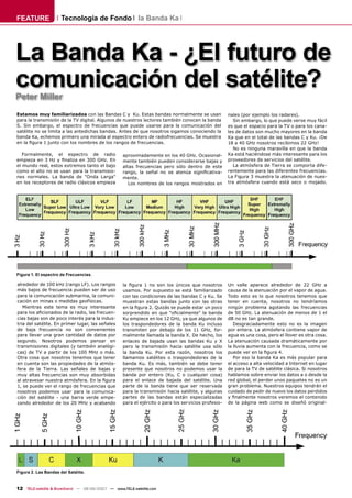 El documento describe la Banda Ka como una posible futura tecnología para comunicaciones por satélite. La Banda Ka ofrece un ancho de banda mayor que las bandas C y Ku actualmente usadas, con 22 GHz disponibles entre 18-40 GHz. Sin embargo, las señales de la Banda Ka son más afectadas por la lluvia. Aunque la Banda Ka puede ser útil para acceso de banda ancha, mover servicios como la televisión digital a esta banda conlleva mayores riesgos debido a su mayor atenuación atmosférica.