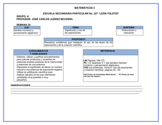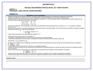 Este documento presenta un plan de clase para una lección sobre potenciación y radicación en Matemáticas 2. La lección cubrirá el cálculo de productos y cocientes de potencias, la interpretación de exponentes negativos, y el uso de notación científica. El profesor guiará actividades para que los estudiantes descubran patrones y generalicen reglas sobre potencias. También analizarán errores comunes y métodos alternativos de simplificación de expresiones fraccionarias con exponentes.