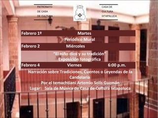 El documento presenta el programa de actividades culturales y artísticas de la Casa de Cultura de Ixtapaluca durante el mes de febrero, incluyendo exposiciones fotográficas, pláticas, conciertos, inauguraciones de exposiciones de talleres y clausuras de cursos con presentaciones de alumnos de batería, guitarra, canto, violín, danza regional, teatro y otros.