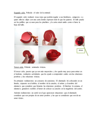 El documento describe las actividades planeadas para una semana del amor en una escuela. Los estudiantes de diferentes niveles de edad realizarán películas, debates y manualidades sobre el amor positivo y las relaciones tóxicas, como corazones, móviles, rosas y carteles. El objetivo es enseñar a los estudiantes a querer de manera positiva a las personas que les rodean.
