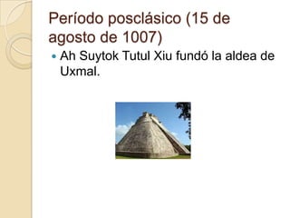 Este documento lista fechas importantes en la historia de los mayas. En 1007, Ah Suytok Tutul Xiu fundó la aldea de Uxmal. En 1027 comenzó la Liga de Mayapán, una alianza militar entre los itzáes, tutul xiúes y cocomes. En 1194, los cocomes expulsaron a los itzáes de Chichén Itzá, terminando la Liga. En 1204 comenzó el dominio de Mayapán con la ayuda de los ah canul. En 1461, los tutul xiúes destruyeron Mayapán