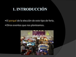 El documento describe la organización de una feria laboral para conectar a estudiantes de comunicación con empresas del sector. Se detallan actividades y talleres, así como estrategias de medios y cronograma de eventos previos y durante la feria. La feria se llevará a cabo del 28 al 30 de junio de 2014 en IFEMA, Madrid, y tiene como objetivo primario facilitar el contacto entre jóvenes titulados y empleadores.