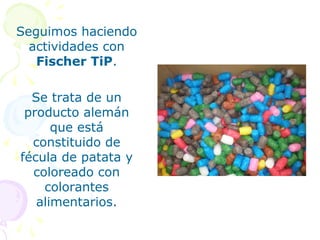 El documento describe las actividades que se realizan con Fischer TiP, un producto alemán hecho de fécula de patata y colorantes alimentarios que se puede moldear con agua. Se muestran ejemplos de figuras que los niños pueden hacer con Fischer TiP, como casas, coches, molinos, osos y más. El documento anima a los niños a hacer sus propias creaciones con Fischer TiP y compartirlas.
