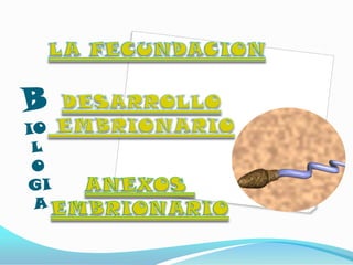 El documento describe las etapas del desarrollo embrionario humano desde la fecundación hasta la primera etapa de la gestación. La fecundación ocurre cuando un espermatozoide fertiliza un óvulo, formando un cigoto que se divide por mitosis en una mórula y luego una blástula. La blástula se transforma en una gástrula con tres capas germinales (ectodermo, mesodermo y endodermo) y comienza la diferenciación celular. El desarrollo embrionario depende de anexos como el sac