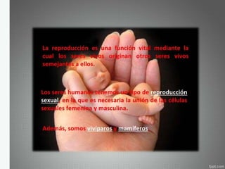 La fecundación humana ocurre cuando un espermatozoide se introduce en un óvulo, formando un cigoto que inicia el desarrollo embrionario. El documento describe detalladamente las etapas de la fecundación y el desarrollo del embrión desde el día 1 hasta el nacimiento, incluyendo cambios y formaciones clave a lo largo del proceso. También se menciona la importancia de los gametos y la formación del sistema nervioso y otros órganos durante el embarazo.