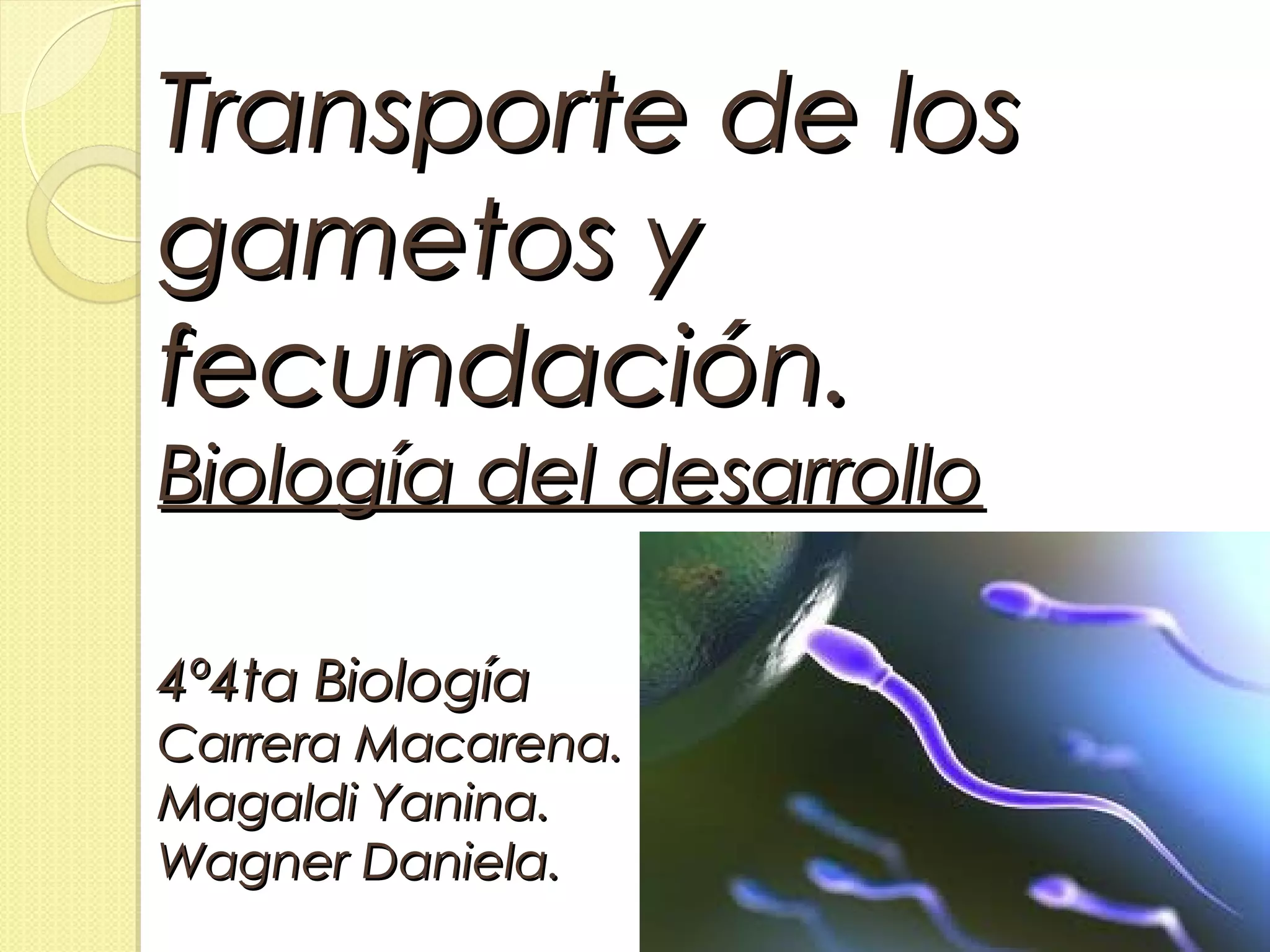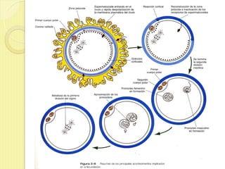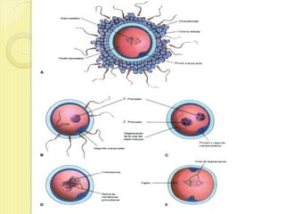 El documento resume los procesos de ovulación, transporte de gametos, capacitación espermática, fecundación y segmentación del cigoto. La ovulación ocurre tras el pico de LH, rompiéndose el folículo y expulsándose el óvulo a la cavidad peritoneal. Los espermatozoides son transportados a través de la vagina, cuello uterino y trompas de Falopio, donde se capacitan. La fecundación ocurre cuando un espermatozoide capacitado se une y fusiona con el óvulo, formándose el cigoto