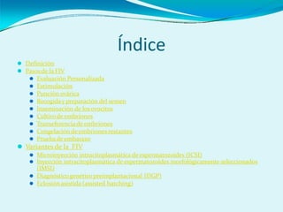 La fecundación in vitro (FIV) es un procedimiento de reproducción asistida donde la fertilización ocurre fuera del cuerpo. Involucra la estimulación ovárica, la extracción de óvulos, la inseminación con esperma, el cultivo de embriones y la transferencia de uno o más embriones al útero. Variantes como la microinyección intracitoplasmática de espermatozoides (ICSI) y el diagnóstico genético preimplantacional (DGP) también se describen. La FIV ofrece la posibilidad de concebir para
