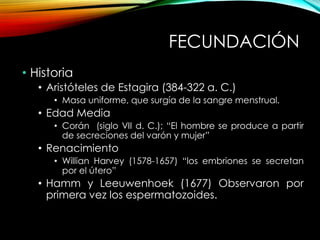 El documento resume las etapas clave de la fecundación y el desarrollo embrionario temprano. La fecundación ocurre cuando el espermatozoide y el óvulo se unen para formar un cigoto. Este luego se divide repetidamente a través de la segmentación para formar una mórula, la cual se convierte en un blastocisto cuando se forma una cavidad llena de líquido. Finalmente, el blastocisto se implanta en el útero alrededor del sexto día, iniciando el desarrollo del embrión.