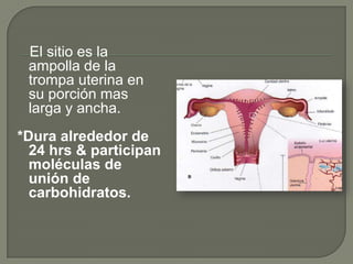 La fecundación involucra la fusión del espermatozoide y el ovocito, restaurando el número cromosómico diploide de 46 y determinando el sexo del embrión. Inicia con la penetración del espermatozoide en el ovocito y termina con la fusión de sus pronúcleos, formando el cigoto.