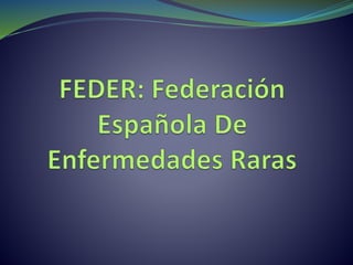 Este documento resume las enfermedades raras (ER), que afectan al 7% de la población y suelen ser genéticas. Entre la aparición de los síntomas y el diagnóstico pueden pasar 5-10 años y algunos pacientes viajan para el diagnóstico o tratamiento. Los pacientes y sus familias a menudo se aíslan socialmente debido a la carga de cuidados. La Federación Española de Enfermedades Raras (FEDER) representa a los pacientes, defiende sus derechos y construye una red de asoci