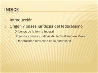 Este documento presenta una introducción al origen y bases jurídicas del federalismo en México. Explica que el sistema federal surgió como una forma de gobierno que permitía a las provincias mantener su autonomía al mismo tiempo que unían esfuerzos bajo una estructura política común. Detalla los orígenes del federalismo en los Estados Unidos y cómo este modelo inspiró la adopción del sistema federal en México después de la independencia, aunque el camino fue diferente debido a la historia centralista de la Nueva España. Finalmente, resume las características